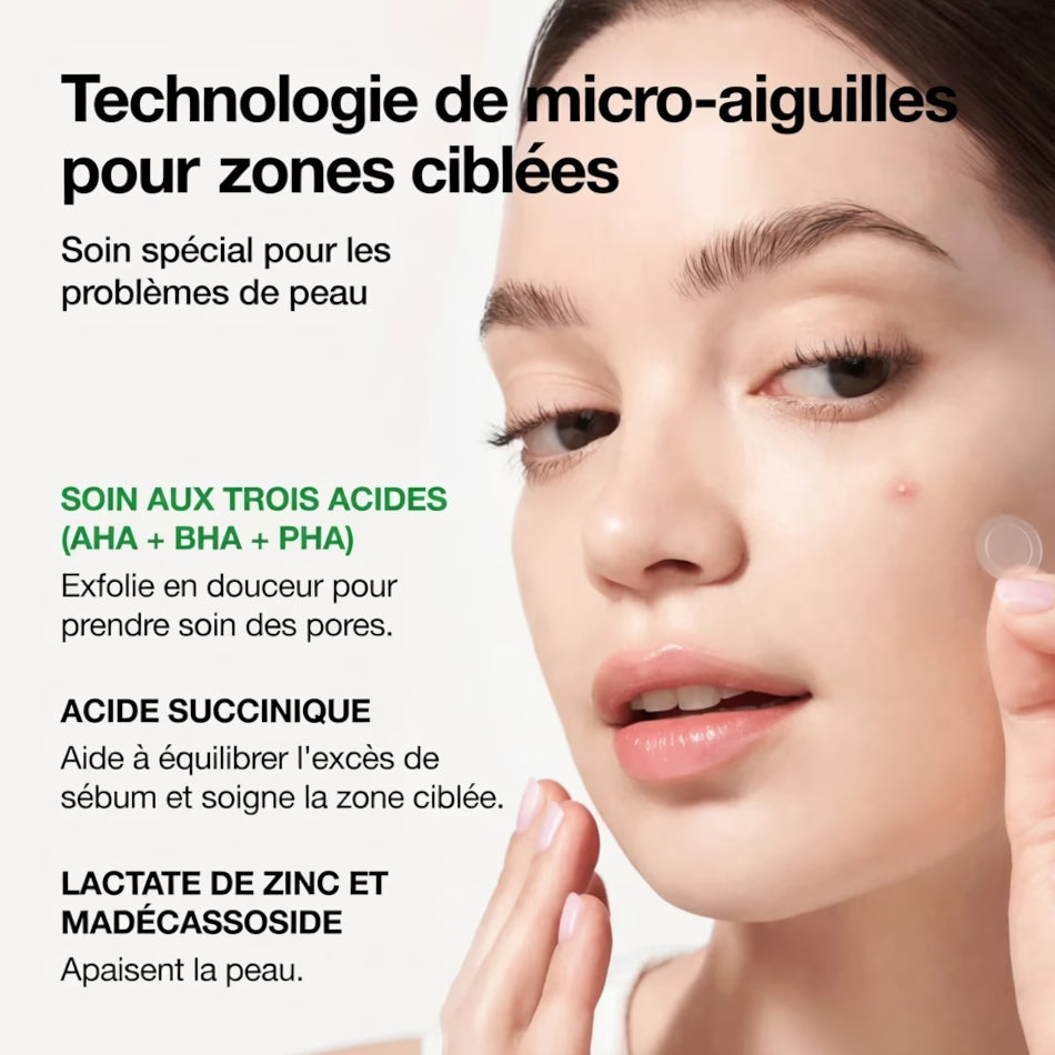 - 200+ micro-aiguilles de 0,3 mm qui délivrent les actifs directement au cœur de l'imperfection