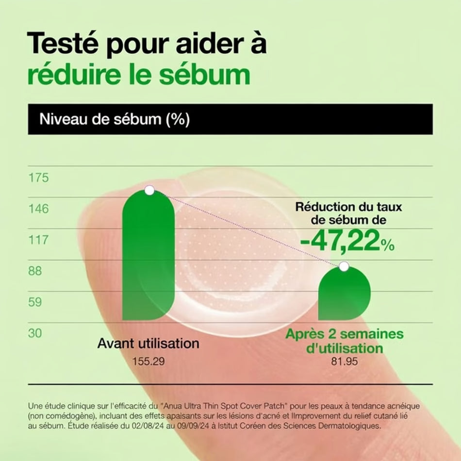 Les ANUA Triple Acid Spot Care Microdart Patch sont des patchs anti-imperfections coréens ultra-fins équipés de 200+ micro-aiguilles (0,3 mm) infusées en AHA + BHA + PHA, acide succinique et madécassoside pour exfolier en douceur, purifier les pores et traiter les boutons directement à la source pendant la nuit.